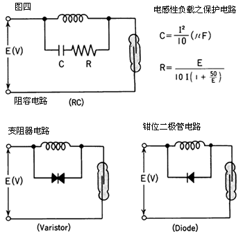 當(dāng)將干簧管用于感性負載,例如電動機÷繼電器線圈、螺線管等,其觸點在(負載電路)觸點開路時將加有高感生電壓。這種(瞬態(tài))高感生電壓可能會損害干簧管或者明顯地降低干簧管地壽命。因此建議采用保護電路,例如阻容(吸收)電路、變阻器或鉗位二極管電路(見圖四)。